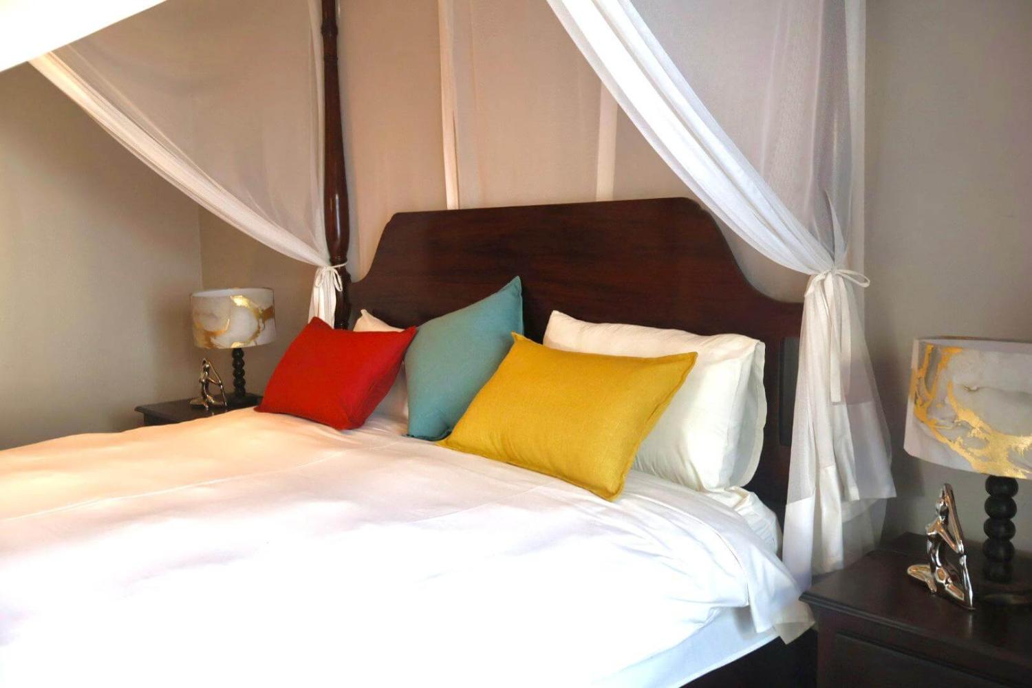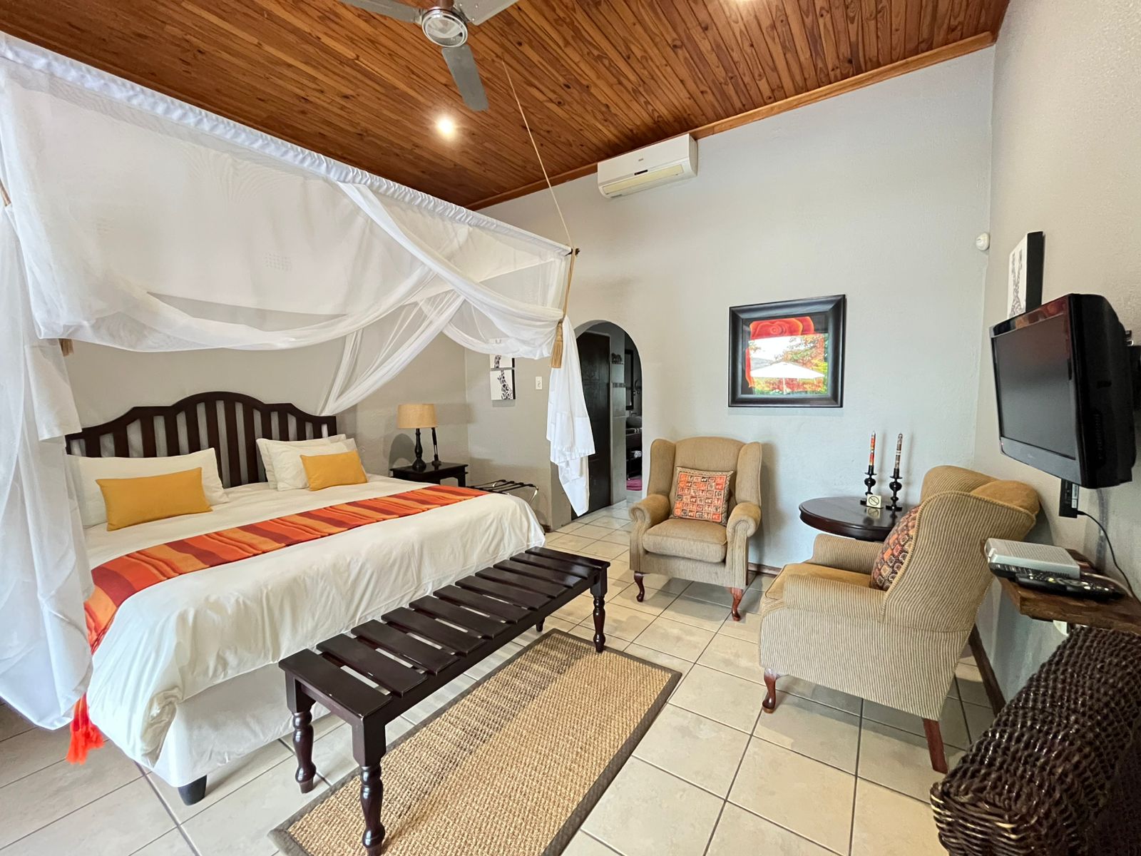 Grande chambre joliment décorée avec climatisation, lit double de grande taille (160X200 cm), rideaux obscurcissant, moustiquaire, grande salle d’eaux avec douche vitrée et spa, deux bassins, toilette séparée, écran plat DSTV, service à café et thé, frigidaire, Sherry gratuit, salon séparé et commode, ventilateur de plafond, trésor électronique, ouvrant sur la véranda avec vue sur le splendide paysage, le jardin et la piscine.