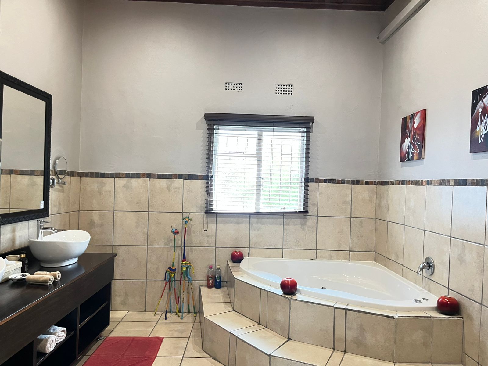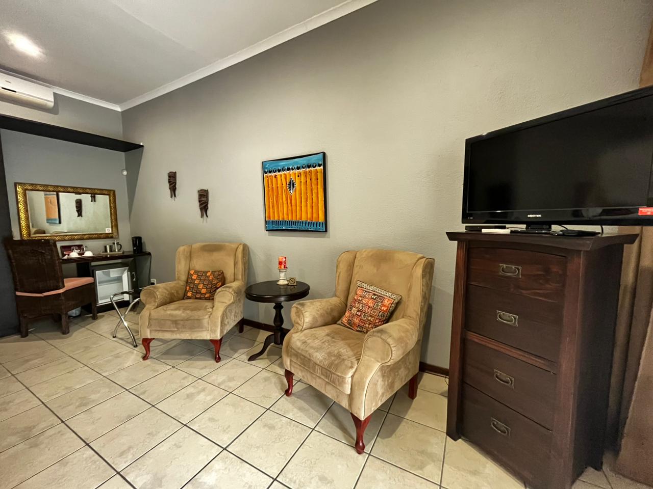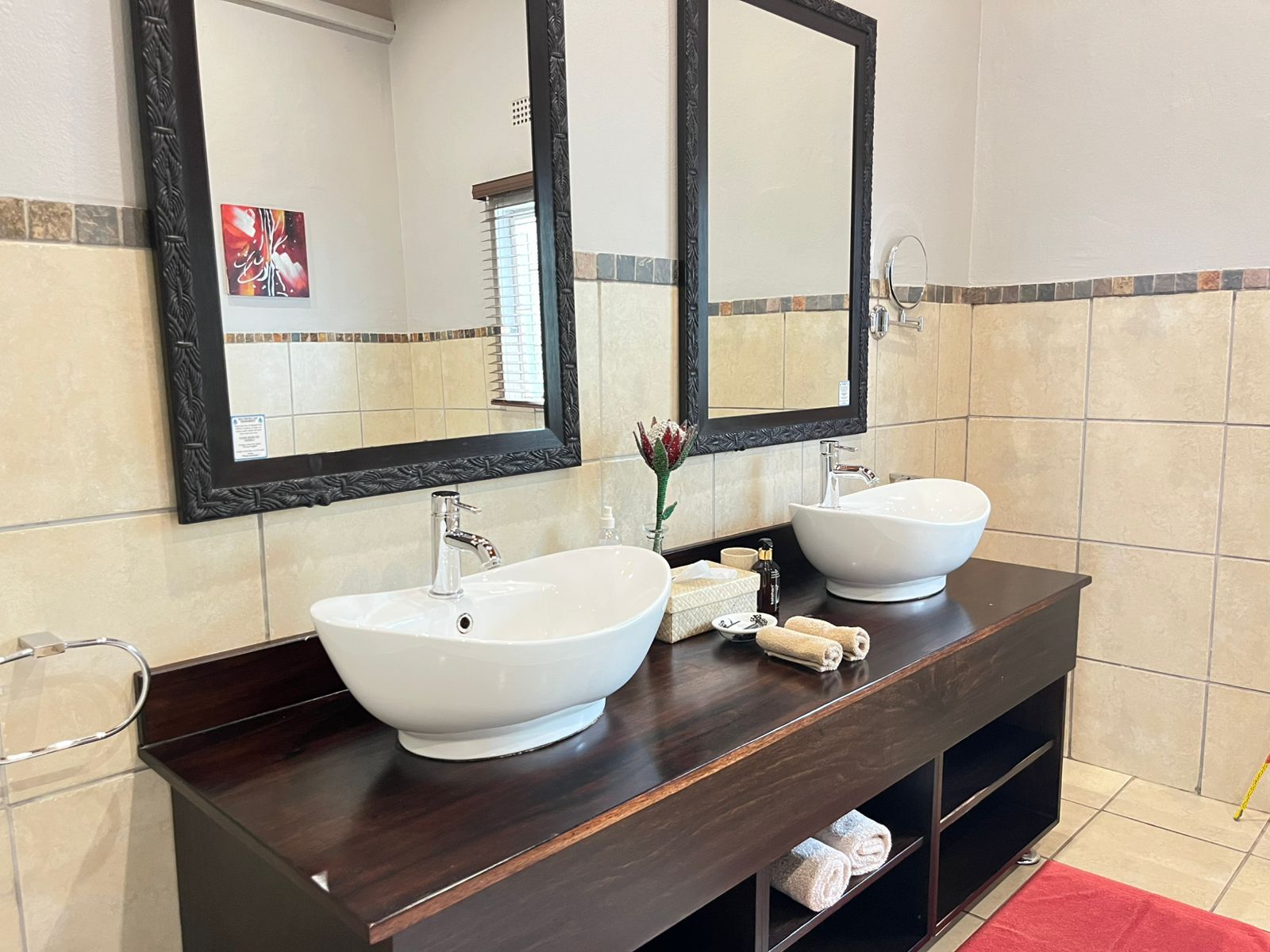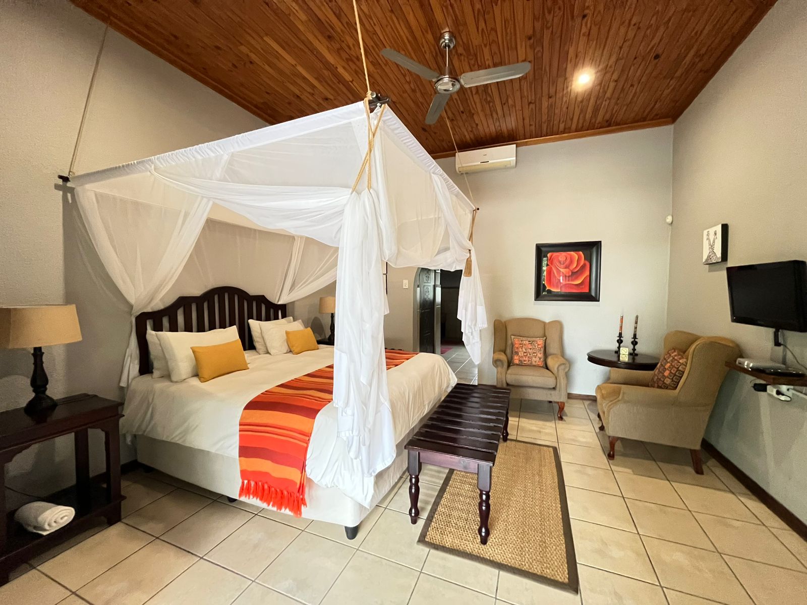 Tastefully decorated large room, air conditioned, with king sized bed, block-out curtains, mosquito net, large en-suite bathroom with glass shower and separate corner jet spa. 2 basins, separate toilet, flat screen DSTV, coffee & tea tray, fridge, separate lounge corner and dressing table, ceiling fan, electronic safe, open onto veranda overlooking the beautiful landscape, garden and pool area.