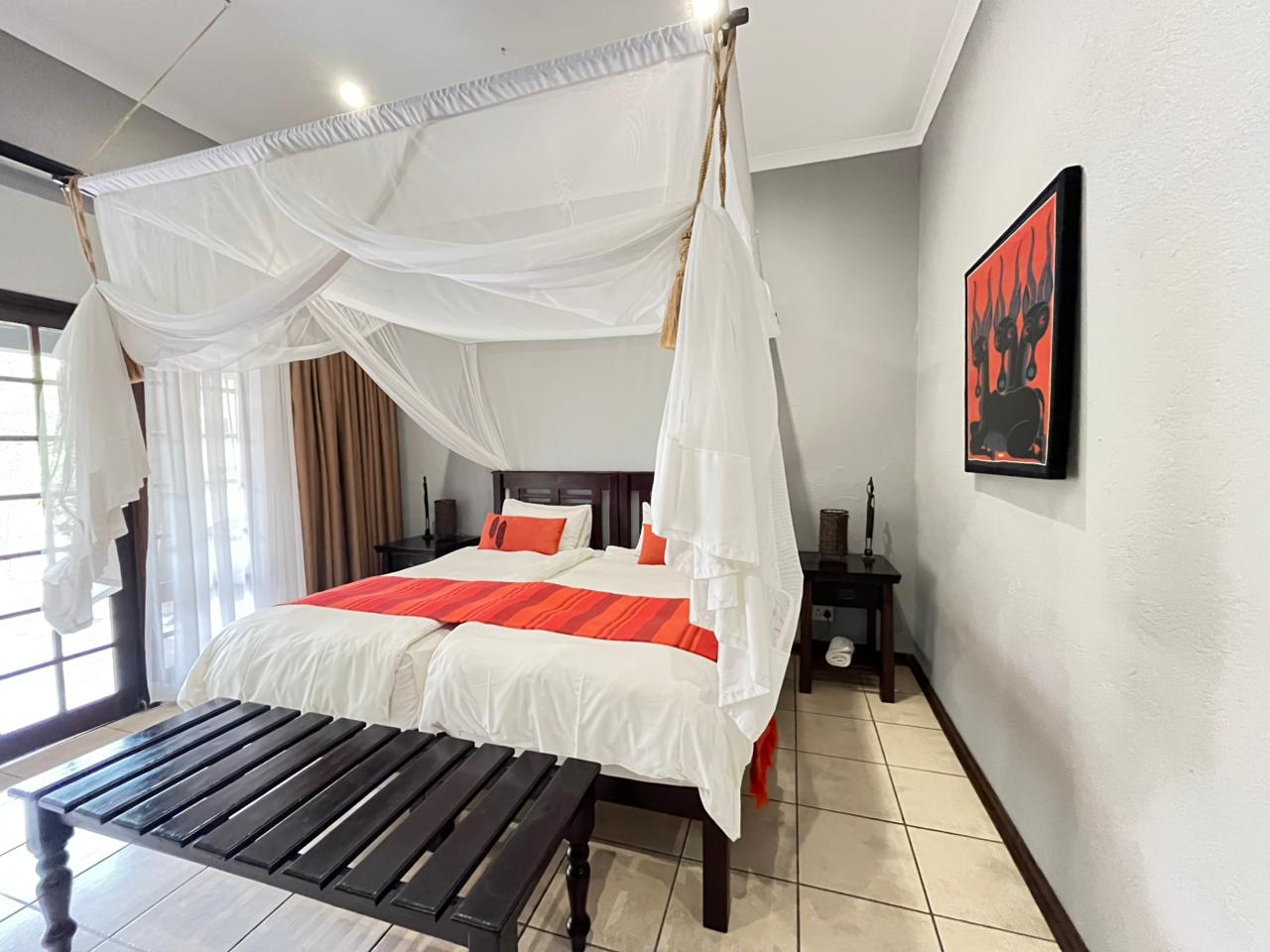 Our 4 Luxury Rooms are large and tastefully decorated, with air conditioner and ceiling fan, opening onto the veranda overlooking the beautiful landscape. All the rooms have twin beds which can be converted into double beds, with mosquito net, luxury en-suite bathroom with glass shower, flat screen DSTV, coffee & tea tray, fridge, and electronic safe.